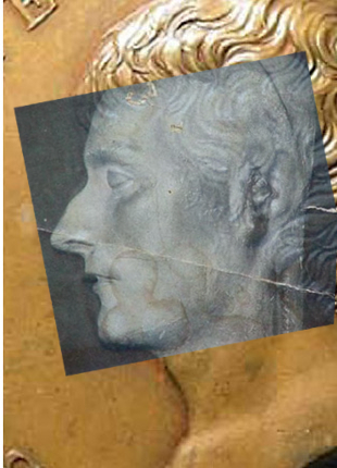 Il se sert du profil "Malmaison". Mais on voit bien que ça ne colle pas : voyez les pommes d'Adam, pas placées de la même manière ! Et les nez ne coïncident pas vraiment...
